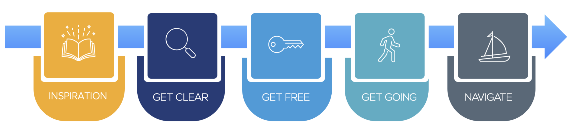 Throughout your journey - from inspiration to action plans - you will be guided by a process in different steps that we call Get Clear, Get Free, and Get Going. In the final step, Navigation, you consolidate your action plans and lay the foundation for ongoing follow-up and calibration.